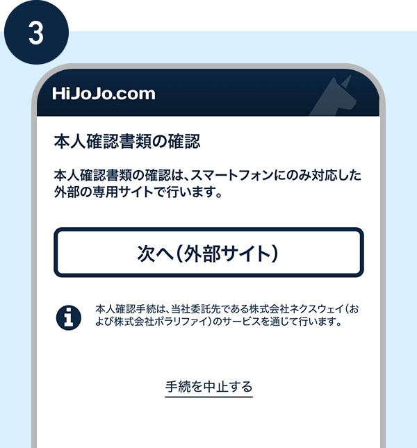 外部サイトの案内にしたがって、本人確認書類の提出をお願いいたします。